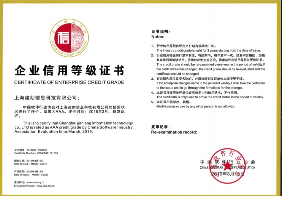 上海午夜视频网站信息科技有限公司以突出的综合实力和良好的社会口碑被授予全国“AAA级信用企业”光荣称号,并获颁企业信用等级证书。这一殊荣是午夜视频网站多年来诚信经营积累的集中体现,标志着午夜视频网站的履约能力、客户信任、综合实力、社会责任等诚信水平得到用户和市场的认可。