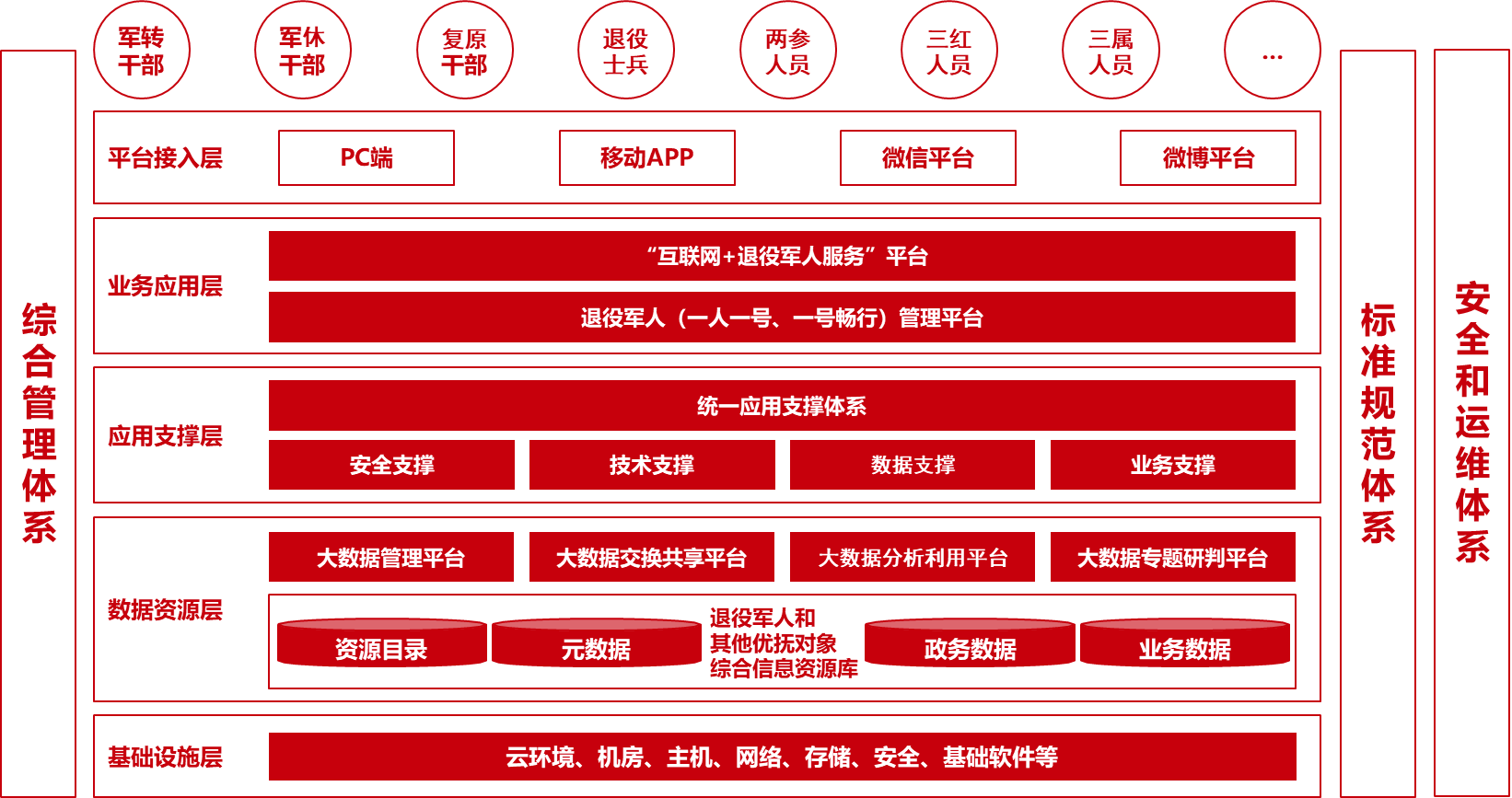 本方案由面向退役军人的网上服务平台(APP、微信、门户网站等)和面向退役军人事业部、委办局、管理干部的网上工作平台组成。两个平台后台相联,实现了组织网上联通,事务网上办理,信息网上推送,服务网上互动。通过整合退役军人内部已有服务,结合市场化第三方服务,为退役军人提供一站式服务平台,大大提升了服务面和服务的深度,为退役军人的工作、生活、学习、安置建了良好的环境,提升了退役军人对于政府的认同感和归属感。